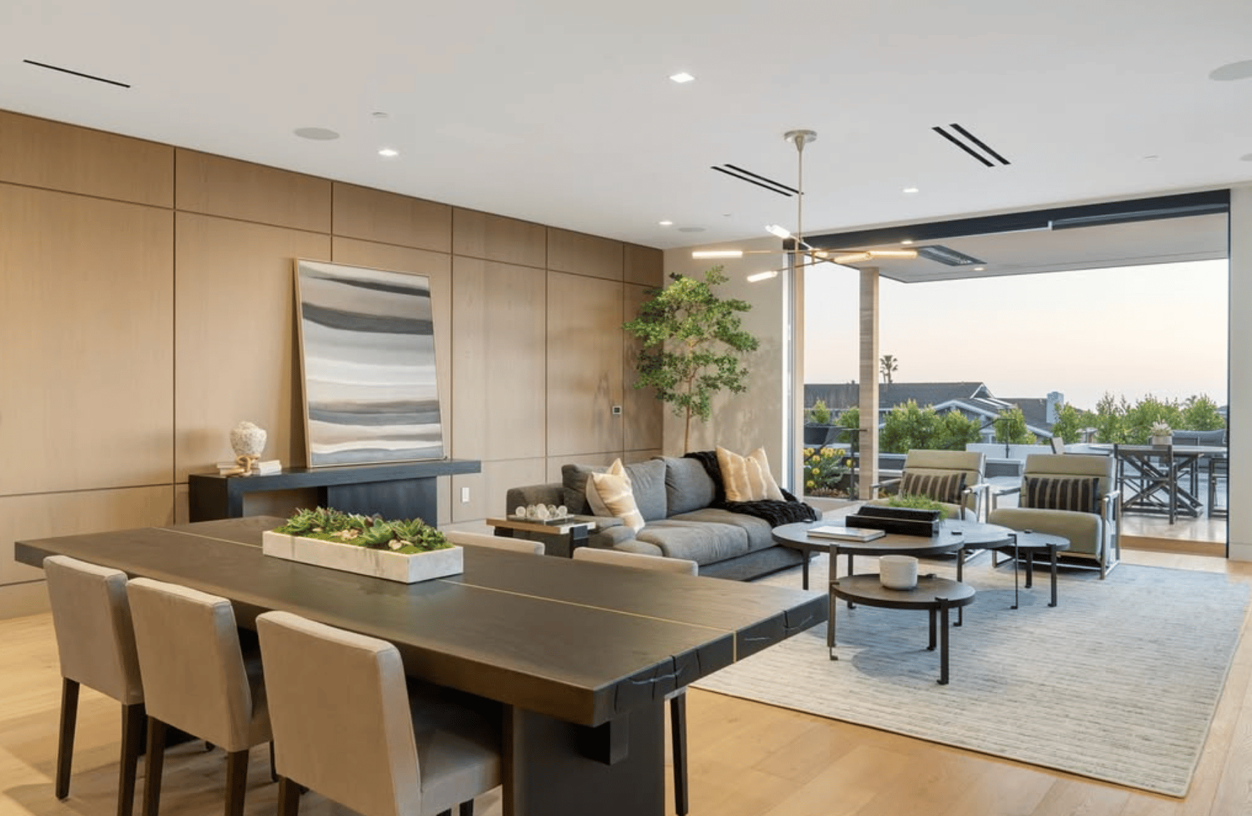 Design-forward details: modern chandeliers, flush-mount paneling, and warm natural materials throughout