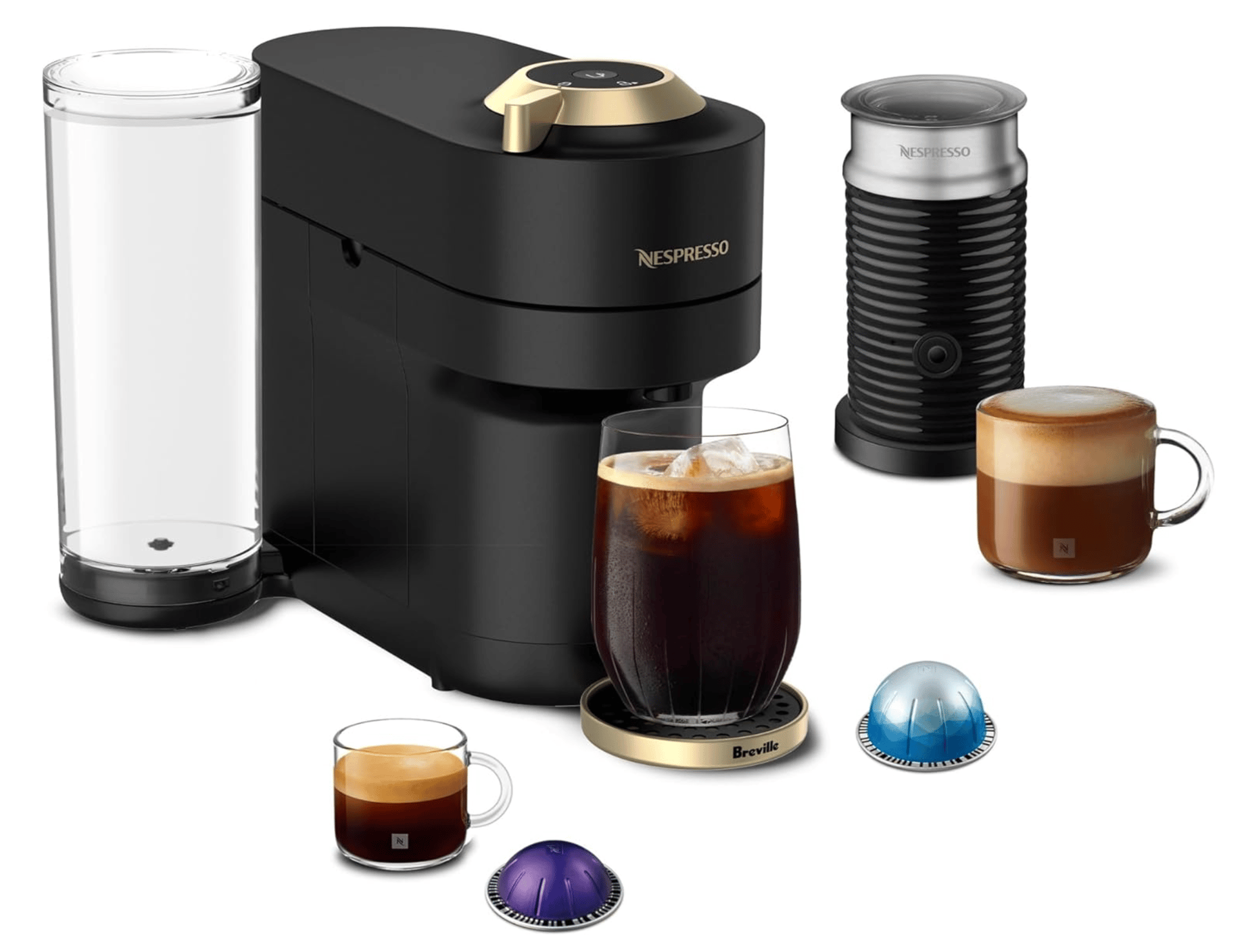 Brews both coffee and espresso using Nespresso’s Vertuo pod system