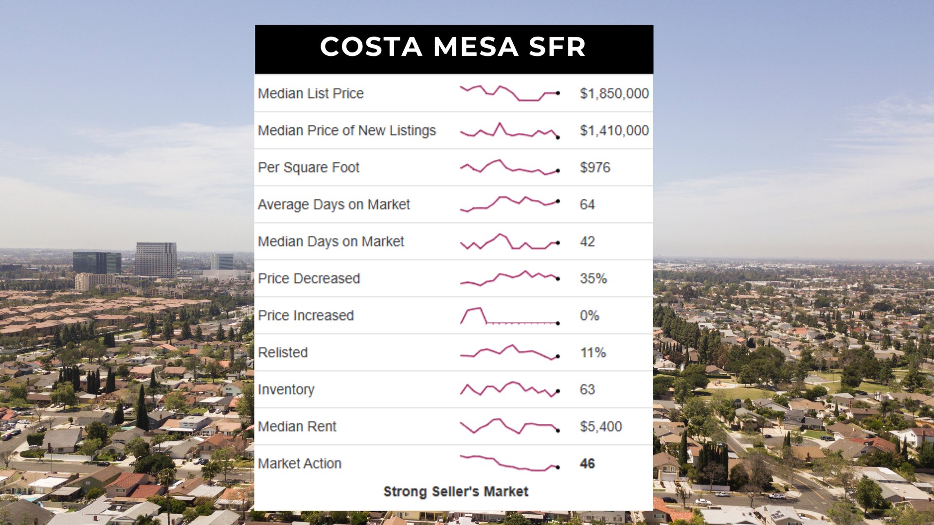 The Costa Mesa single-family home market sits firmly in a strong seller’s market with a Market Action Index (MAI) of 46, up slightly from 45 last month. The median list price is $1,850,000, and inventory has decreased to just 63 homes. Although prices have plateaued, strong buyer activity relative to supply suggests potential upward movement ahead.
