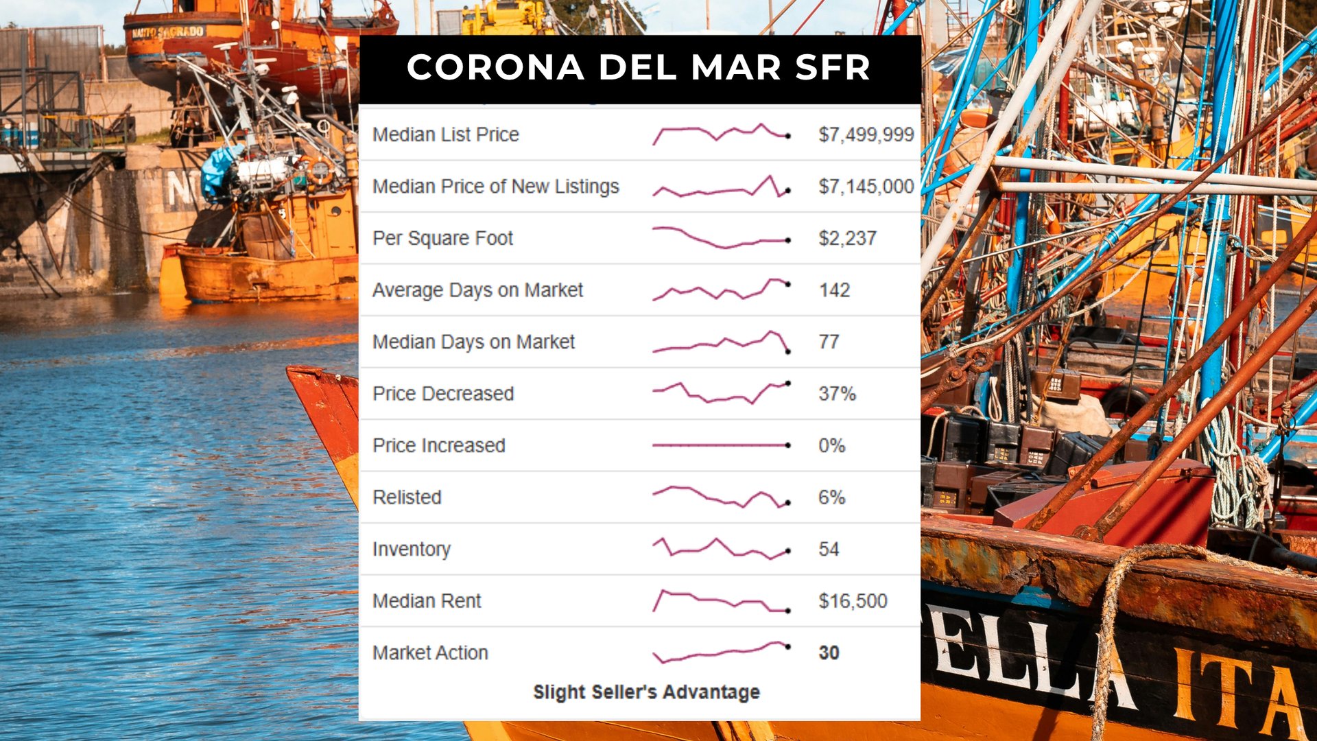 The single-family home market in Corona del Mar shows a slight seller’s advantage with a Market Action Index (MAI) of 30, up marginally from 29 last month. The median list price stands at $7,499,999, with inventory holding steady at 54 homes. Although technically still favoring sellers, pricing remains flat as the market navigates a delicate supply-demand balance.