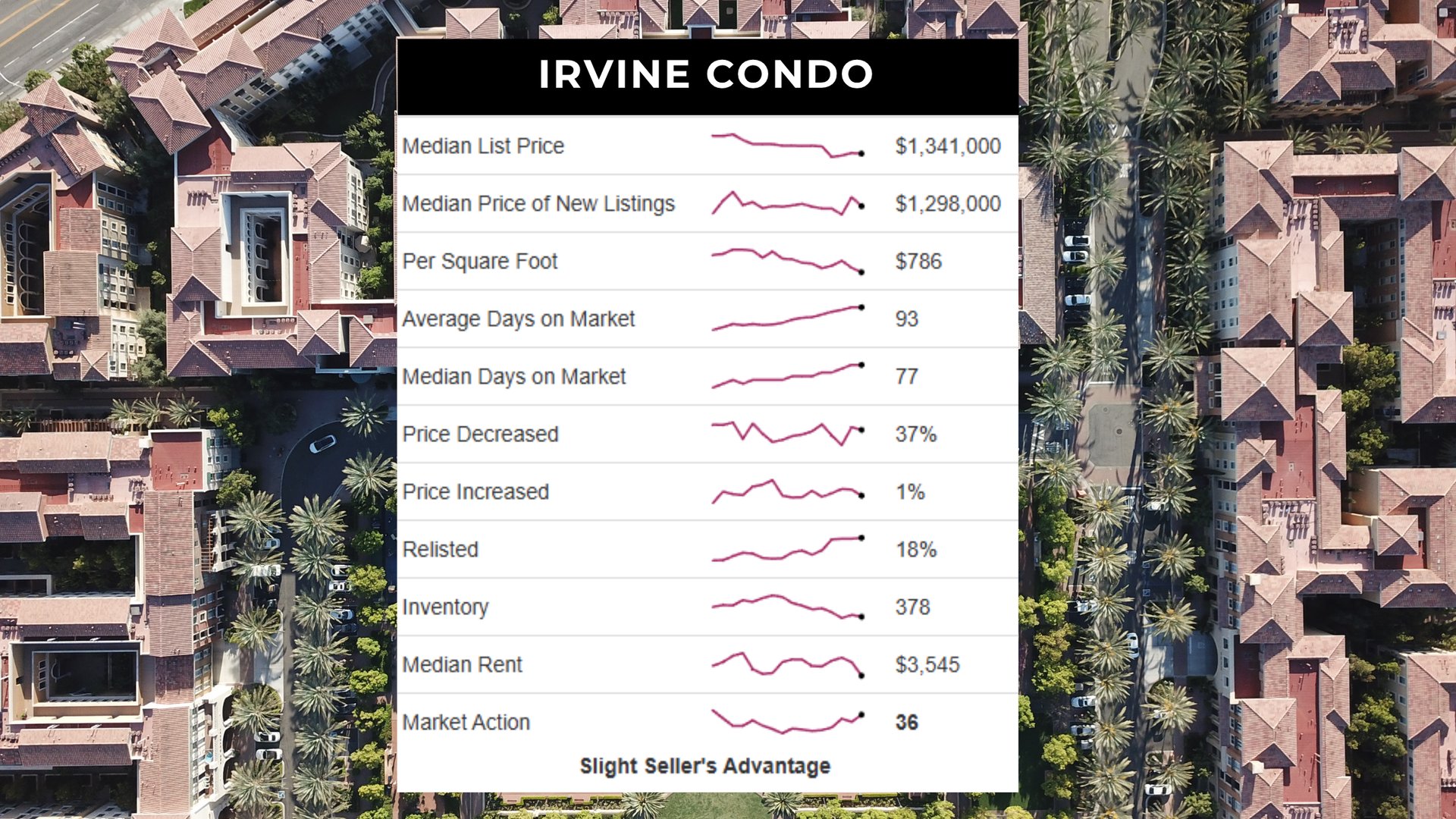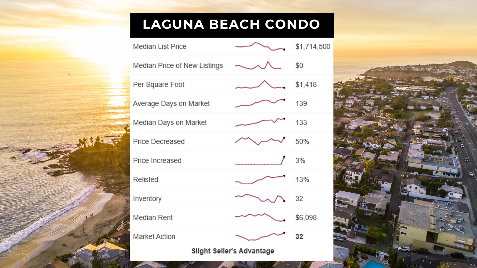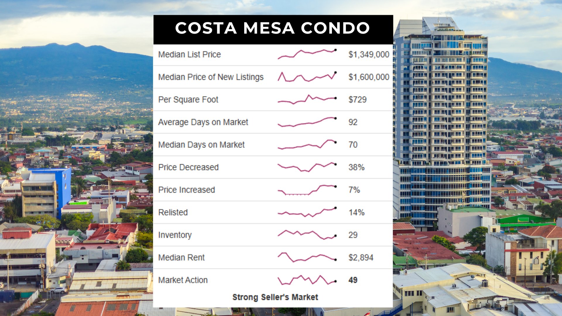 The Costa Mesa condo market remains in a strong seller’s market with a Market Action Index (MAI) of 49, slightly down from 50 last month. The median list price is $1,349,000, and inventory has decreased to 29 units. While buyer demand remains strong, the market has started cooling and could see price softening if this trend continues.