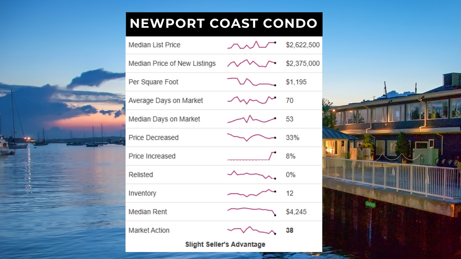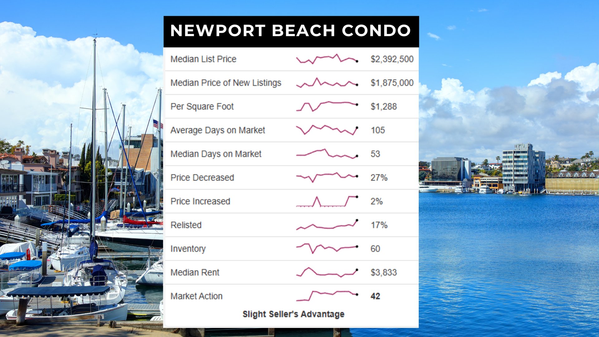 The Newport Beach condo market holds a slight seller’s advantage with a Market Action Index (MAI) of 42, slightly down from 43 last month. The median list price is $2,392,500, while inventory has increased to 60 units. Despite being in seller territory, the market shows signs of cooling, with flat pricing and longer market times.