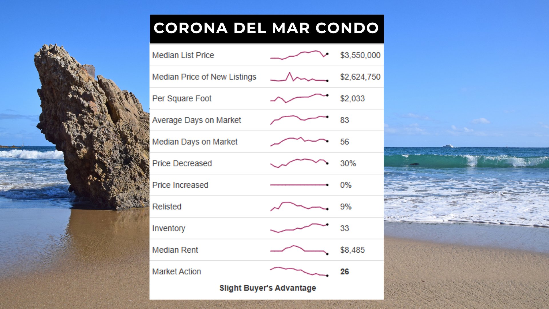 The Corona del Mar condo market is currently in a slight buyer’s advantage position with a Market Action Index (MAI) of 26, down from 29 last month. The median list price is $3,550,000, while inventory has increased to 33 units. Despite softening market action, pricing remains elevated, likely due to larger, higher-end condos entering the market.