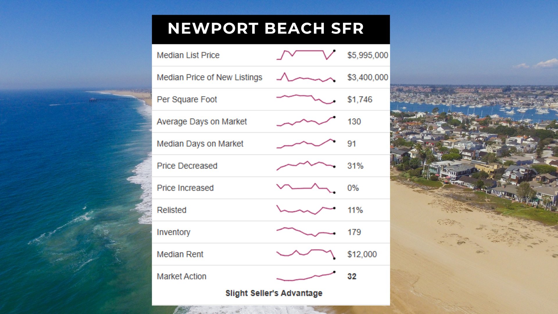 The Newport Beach single-family home market holds a slight seller’s advantage with a Market Action Index (MAI) of 32, up from 31 last month. The median list price is $5,995,000, while inventory has decreased to just 179 homes. With demand outpacing supply, continued upward pricing pressure is possible if the trend persists.