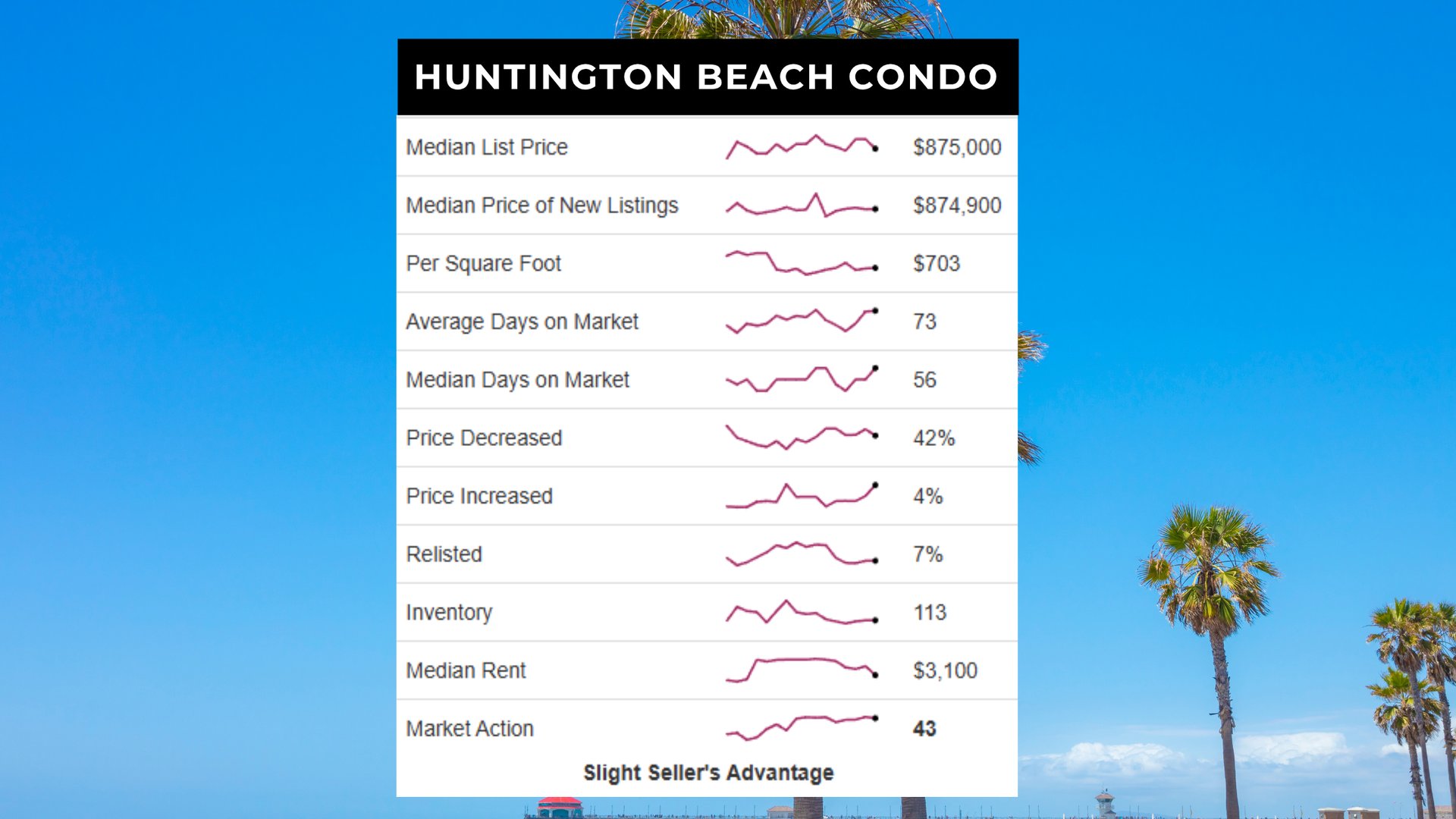 The Huntington Beach condo market is currently in a strong seller’s market with a Market Action Index (MAI) of 47, holding steady from last month. Although prices have plateaued, inventory continues to fall, creating firm seller leverage. If buyer demand persists, pricing may rebound upward in the near term.