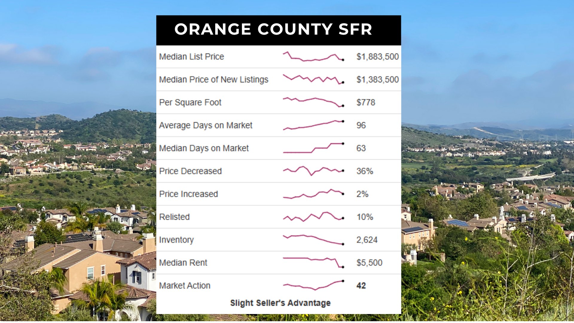 The Orange County single-family housing market continues to show a slight seller’s advantage, with the Market Action Index (MAI) steady at 42. The median list price is $1,883,500, while inventory has declined to 2,624 homes. Days on market remain moderate, but price reductions on over a third of listings indicate ongoing buyer caution.