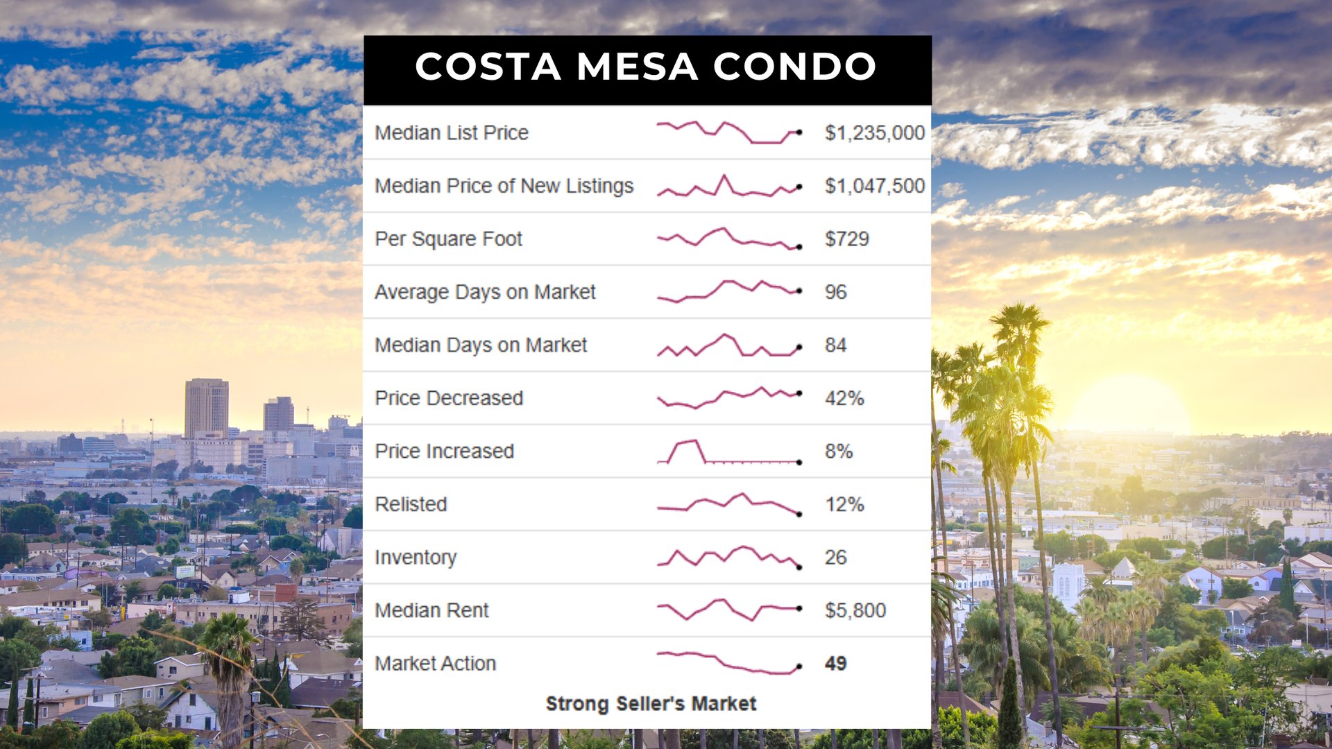The Costa Mesa condo market is holding in a strong seller’s market position with a Market Action Index (MAI) of 49, though slightly down from last month’s 52. The median list price is $1,235,000, and inventory has tightened significantly to just 26 units. Despite strong seller conditions, buyer demand has cooled slightly, and price reductions are common, signaling a possible softening ahead.