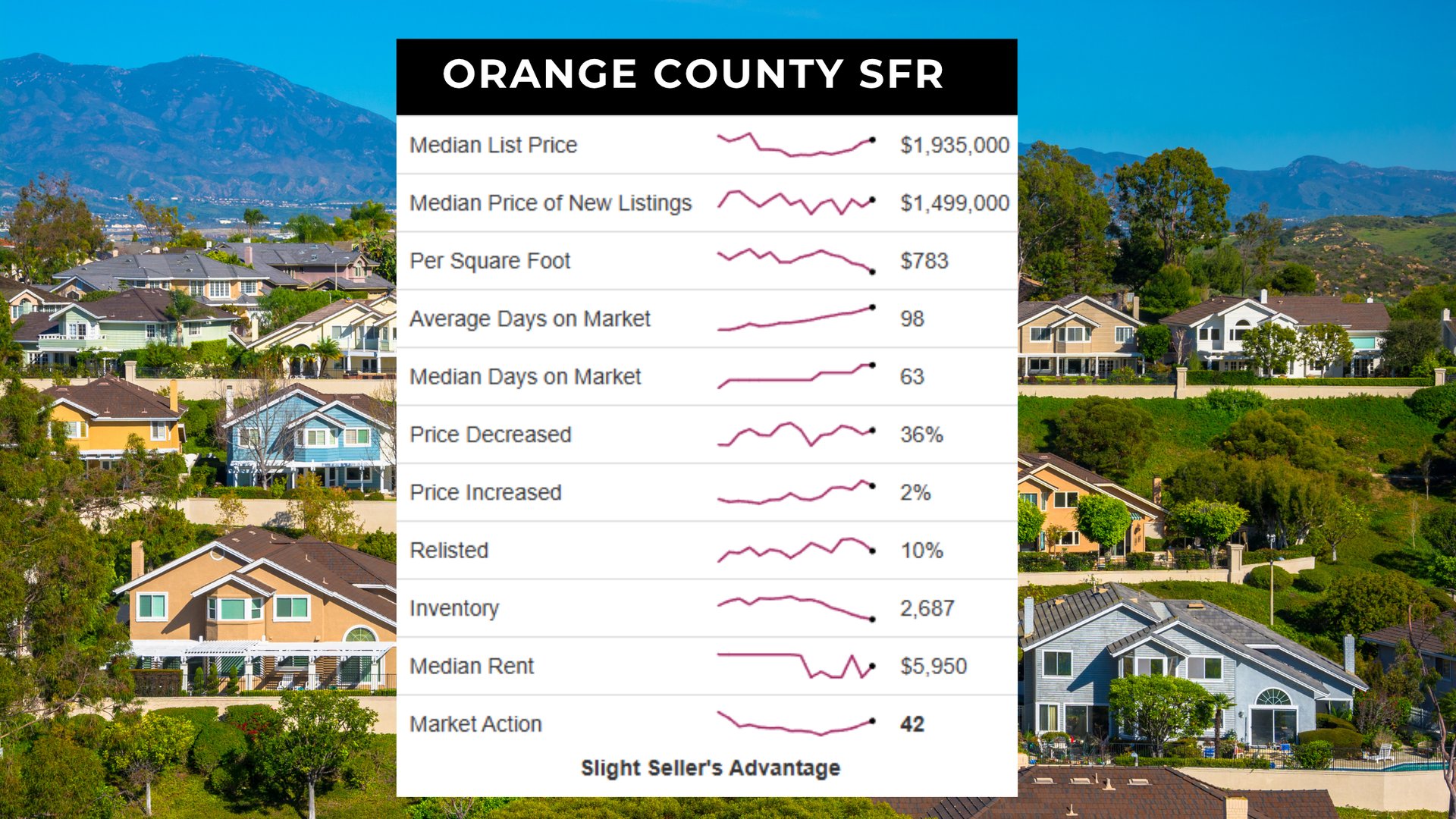 The Orange County SFR housing market continues to show a slight seller's advantage with a Market Action Index (MAI) of 42, edging up from last month’s 41. The median list price has increased to $1,935,000, while inventory has decreased to 2,687, reinforcing a tightening supply trend. However, extended market times and a high percentage of price reductions indicate buyers remain cautious and price-sensitive.